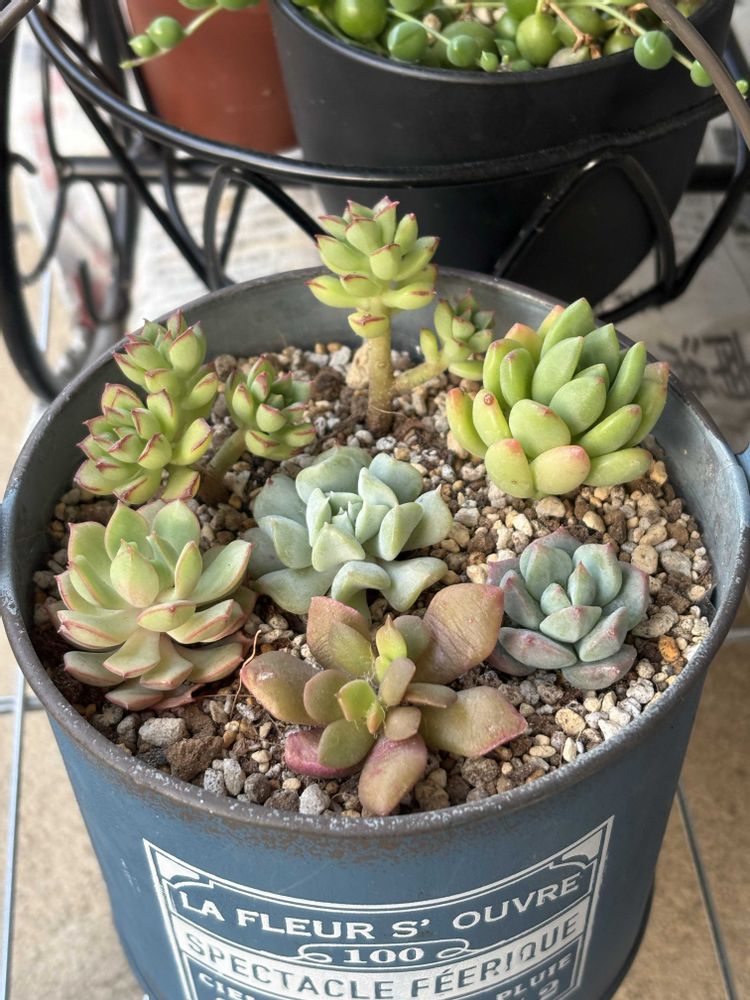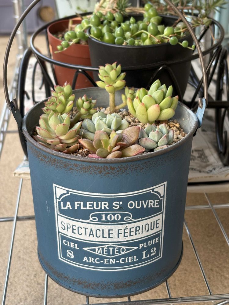 浜松フラワーパークでGETしたブリキ缶の鉢に、チビ多肉さん達を植えてみました❣️