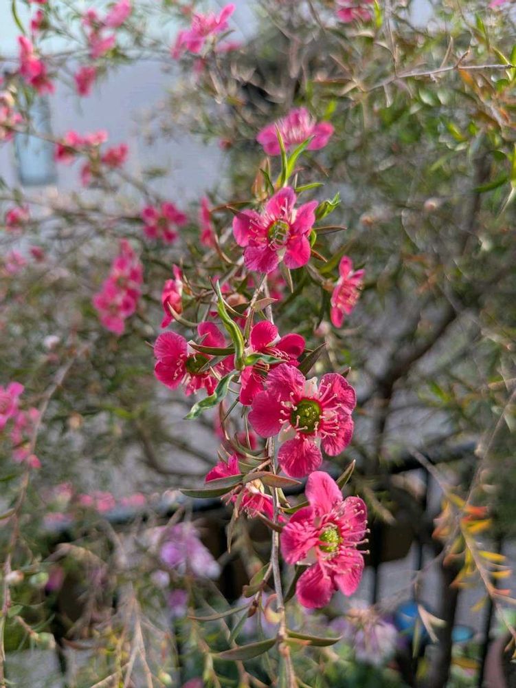 フトモモ科レプトスペルマム属の耐寒性常緑小高木"御柳梅(ぎょりゅうばい)"の花は,鮮やかで綺麗ですね。英名'tea−tree'は,初期のオーストラリアへの移住者が,この木の葉をお茶の代わりに使っていた事に由来します。細い小枝に重なり合い,しなやかに垂れ下がる姿は,ティーカップ☕️の様にも見えます。又,ポリネシア語のひとつのマオリ語では「マヌカ」と呼ばれ,蜂蜜の蜜源としても好まれています。因みに,マヌカハニーとは,この花から採れた蜂蜜の事で,ハーブの様な香りが特徴です。
