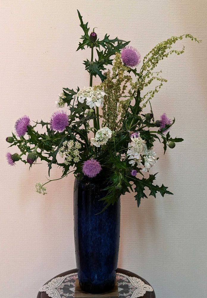 こちらは迷いが感じられなく、大胆に入ったお花たちがそれぞれいい仕事をしています。ツンツンしたアザミに対して緩く軽やかなラインのオルレアが素敵な対比です。