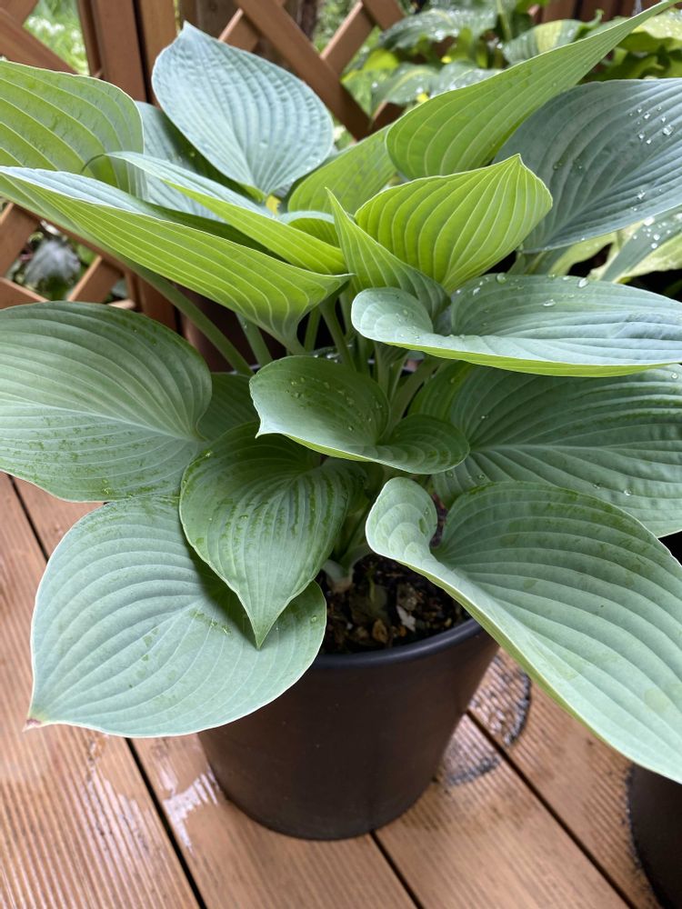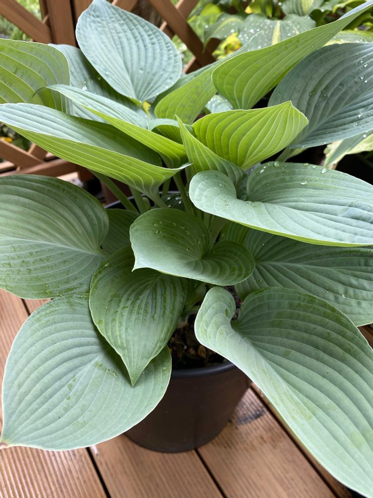 「ホスタのある風景2025」本日は、ブルーハワイです。名前のとおり、パウダリーはブルーが美しいホスタで、艶なしブラックの10号陶器鉢に植えております。うちのホスタの中でも、指折りの「青」であります。
