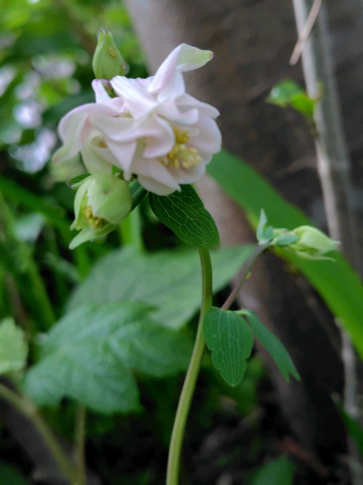 砂利の通路に、数年前から生えて(葉からオダマキと気付き放置)、今年花が咲くまで成長したので移植しました。