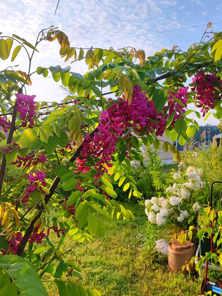 本日の庭の花。無理やり誘引してるハリエンジュ(ロビニア カスケルージュ)&だいぶ散ってきたビバーナム ステリーレ。