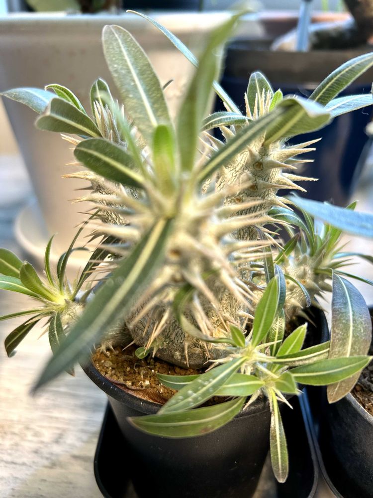 新芽🌱育成記録😊パキポディウム😊皆さん春を感じて新芽が出て来ました😊少し徒長気味です😊デンシフローラムは隣のディッキアのトゲにやられ葉っぱがズタボロです〜😊ビスピノーサムはまだまだ花芽がいっぱい