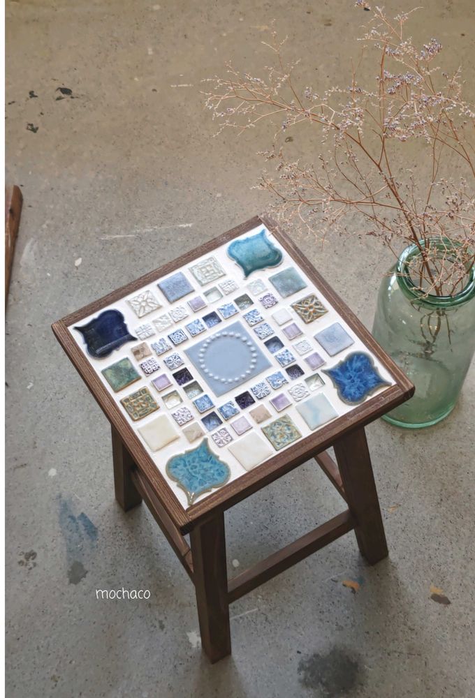 ずっとやってみたかったタイル貼りのWSに参加して来たよ😊ノンさんも前子供イスをブルーに塗ってたよね〜💙