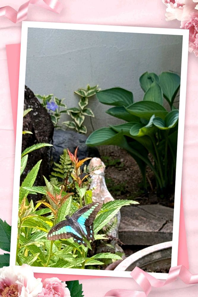 綺麗な蝶々さん この場所は庭の奥で日の当たらない場所 姿勢のいいフォスタとツルニチニチソウが毎年花を添えてくれています