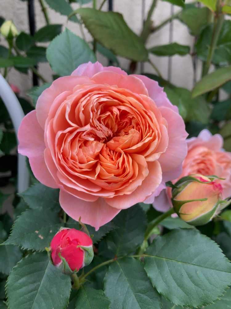 赤いイチゴ🍓の様な薔薇の蕾が咲くとアプリコットなオレンジ色🧡いいな〜👌