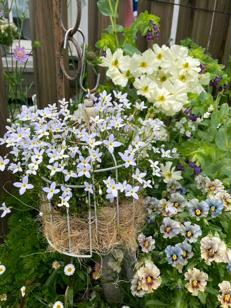 ⑤ダイソーの鳥かご風に植えたヒナソウ🐦️が巣立ちしそうです🤣一緒に植えたプスキニアも既に咲き終わっちゃったけどヒナソウと花色被りすぎて目立たなかった💦ヒナソウを青にすればよかった😂