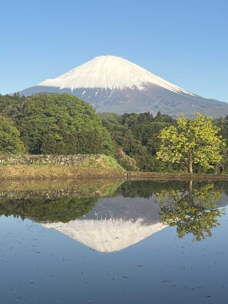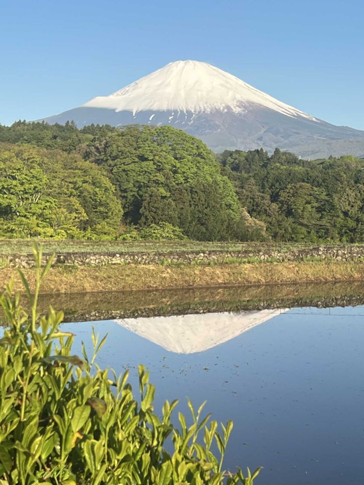 今朝の富士山と茶、逆さ富士、我が家の田植え