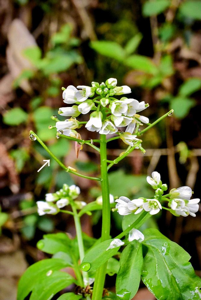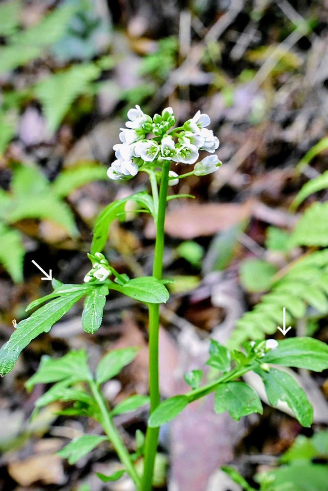 平地での タネツケバナの 変異体で、背丈は 40㎝ にもなります。タネツケバナは 茎が 紫色を帯びるのに対し、茎は 緑色のままです。また、大きさや 姿形などから オオバ(大葉)タネツケバナに 似ているのですが、茎 上部の葉っぱ🌿は それほど大きくは ありません (2枚目)