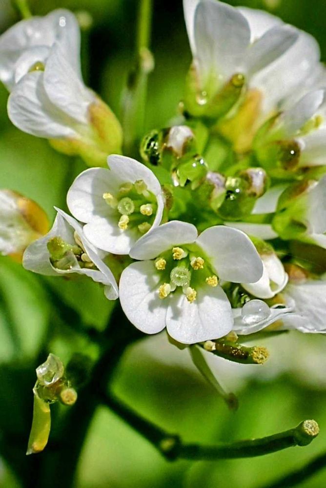 花は「十字花」。雄蕊は 6個で、うち2個は 横に広がり 少し短いようです。雌蕊は 1個・・・(5枚目)