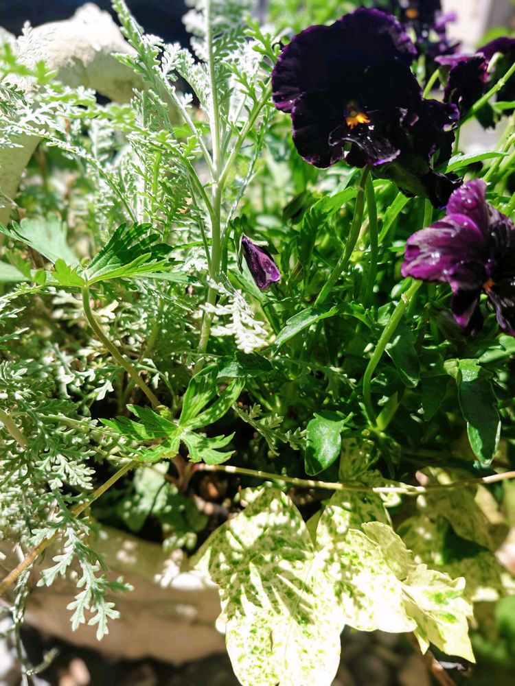 ②鉢植えのビオラやアイビー達の間でオダマキの葉っぱに似ている子が生えてきたので見守っています🎵