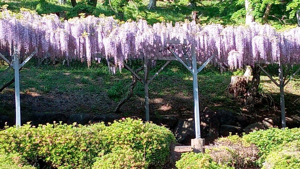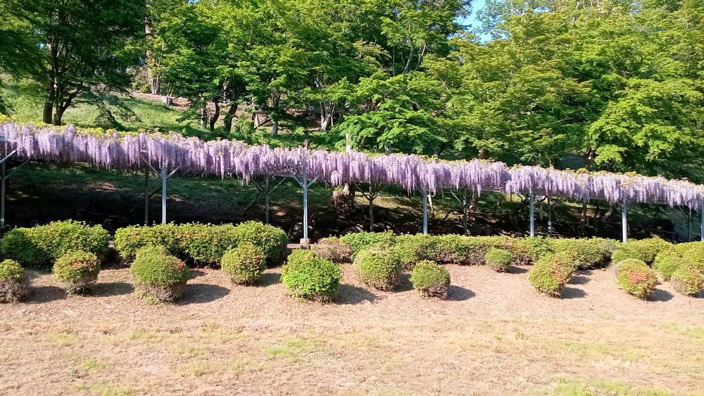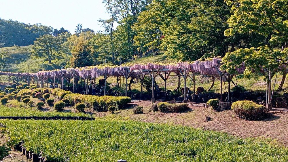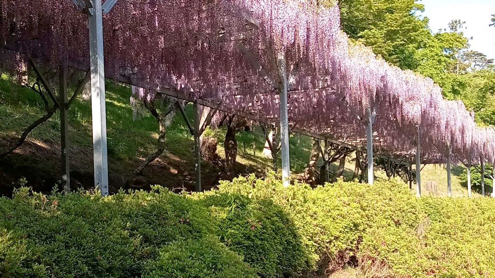 そうなんです。長さ250m位なだらかな坂道に続いている藤棚なんですよ。ただそこに行くまでの道が、⑤枚目のように山の上から続く道をずっと下っていくか、園入り口から急な長い階段を降りてまた上るかの2つの方法しかないので、足がリハビリ途中の今年は無理かな、と諦めていました。でも、藤の花見たさにマイペースで行ってきました。