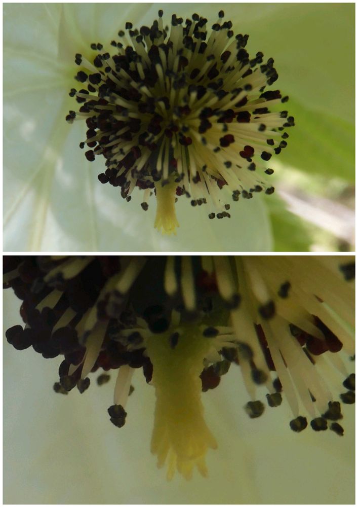 中国中南部原産。雄花が多数球状に集まり、その先に両性花をつけます。雄蕊の葯は黒紫色、両性花の雄蕊は、下の雄花序と混ざって確認できません。雌蕊の先端はタコ足のように、8つくらいに裂けます。この花序の根元を2枚の白い総苞片が囲みます。