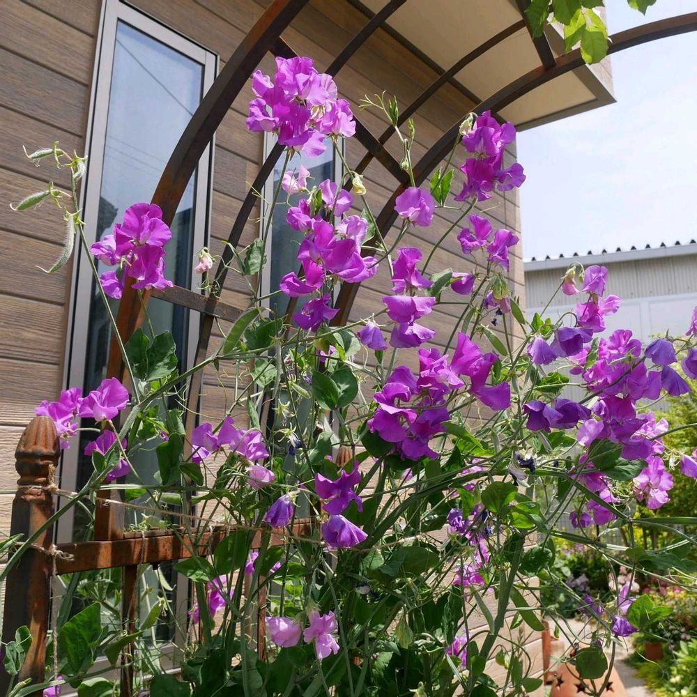 赤でなく紫のスィートピー、アーチに這わせています。