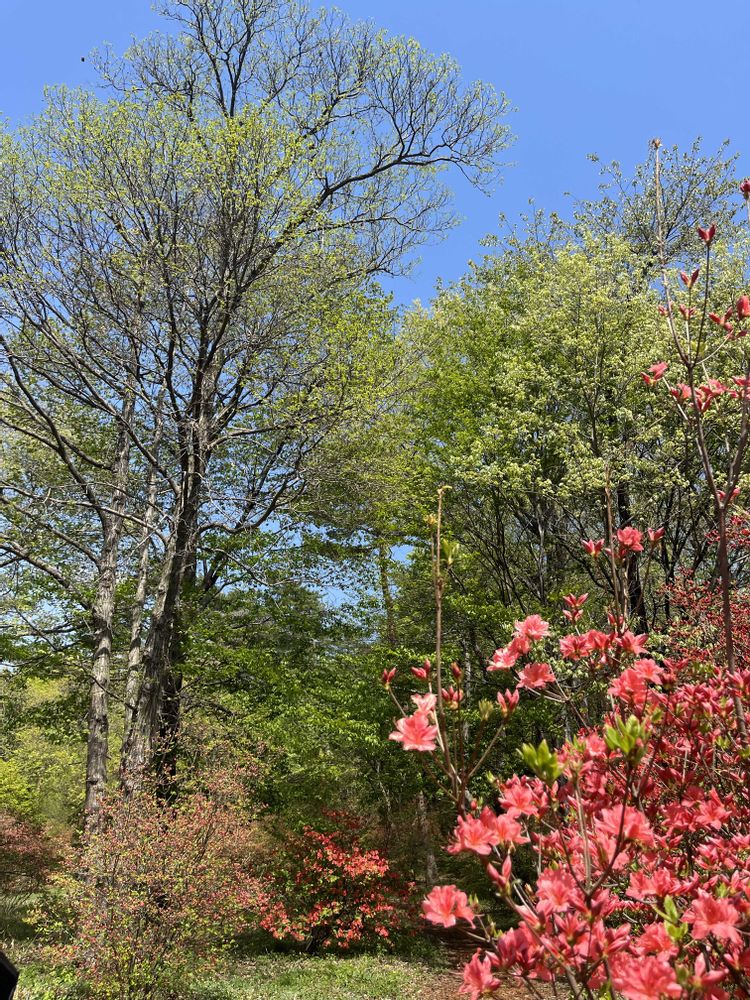 煙るような新緑と山躑躅