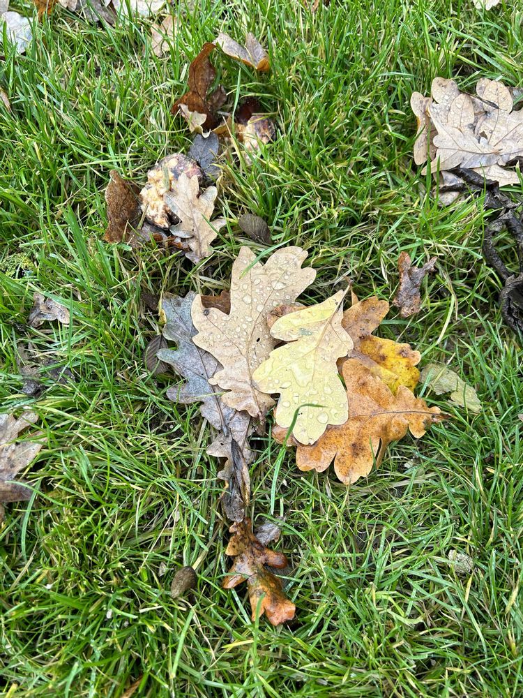 一昨年のクリスマス時期に🎅訪れたフランスの美術館の庭に散るカシワの葉。雨に濡れる芝?はまだグリーンで💛🤎の葉達が美しかった・・・