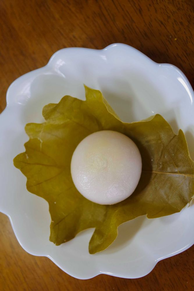 丸形にした上新粉の餅に餡をはさんでカシワの葉で包んだもの