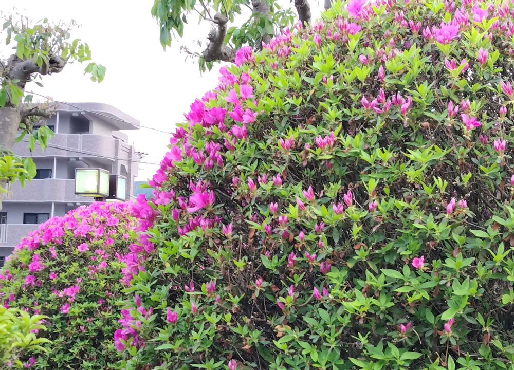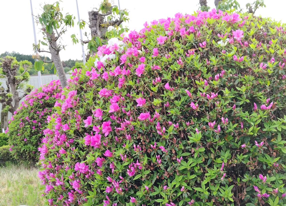 自宅近くの公共施設のまぁるく剪定されたツツジが咲き始めていました❇️🌺❇️🌺❇️