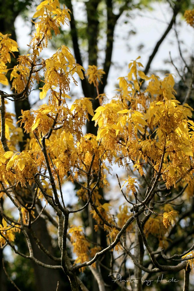 です。原木は大分の山中にあるのだとか??? 春、黄色の新葉を出し花も黄色 夏、緑になるが秋にふたたび黄色となりドングリも黄色