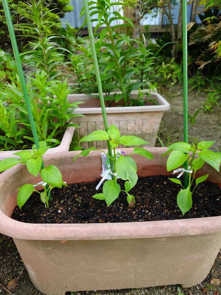 私も小さな家庭菜園にトマトとアマナガシシトウを植えました。