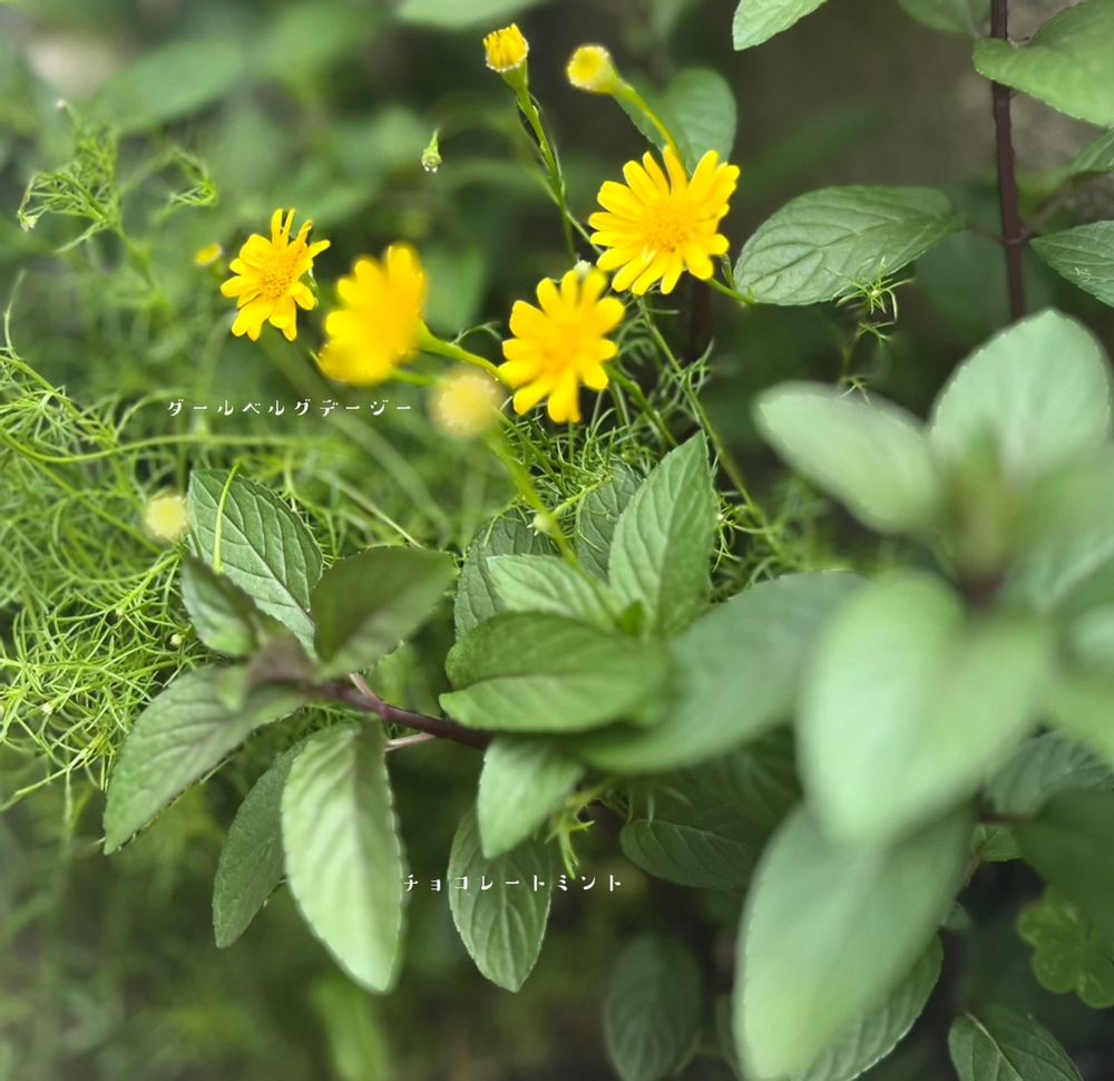 ダールベルクデージー、可愛い黄色のお花、チョコレートミントの前で、映えますね。✨🌿🌻🌿