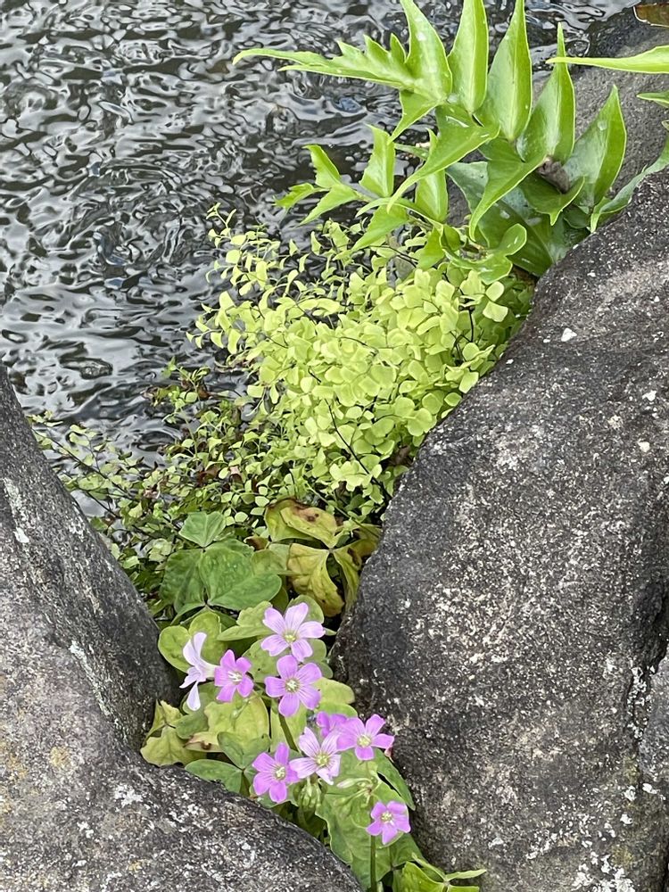 たぶんオニヤブソテツとホウライシダ、そしてムラサキカタバミの3点セット🌿☘️☘️