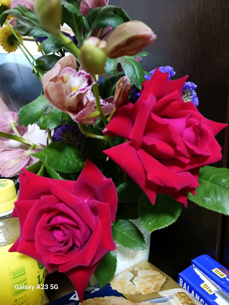 深紅の薔薇が綺麗✨ですね。シンビジウムの白とよく合っていますね。