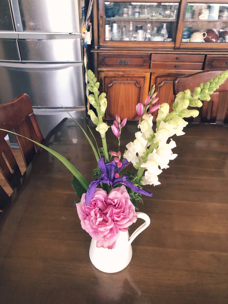 うちの中が暗いしいいところがないのでUPできないでいましたが、かわいい花たちを実家の母からもらいいけました.台所で飾っています.イキシャがクルクル回ってうまく行きません.カキツバタが咲き始めました.