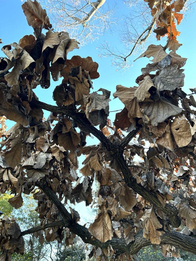 大きなかどの丸い切れ込みの葉っぱが特徴で、冬枯れても木にずっと残っていて、次の新芽が出てくると落ちます