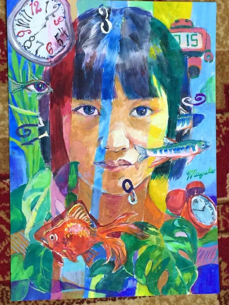 タイトル「モンステラと娘と金魚と時計と」 水彩、アクリル
