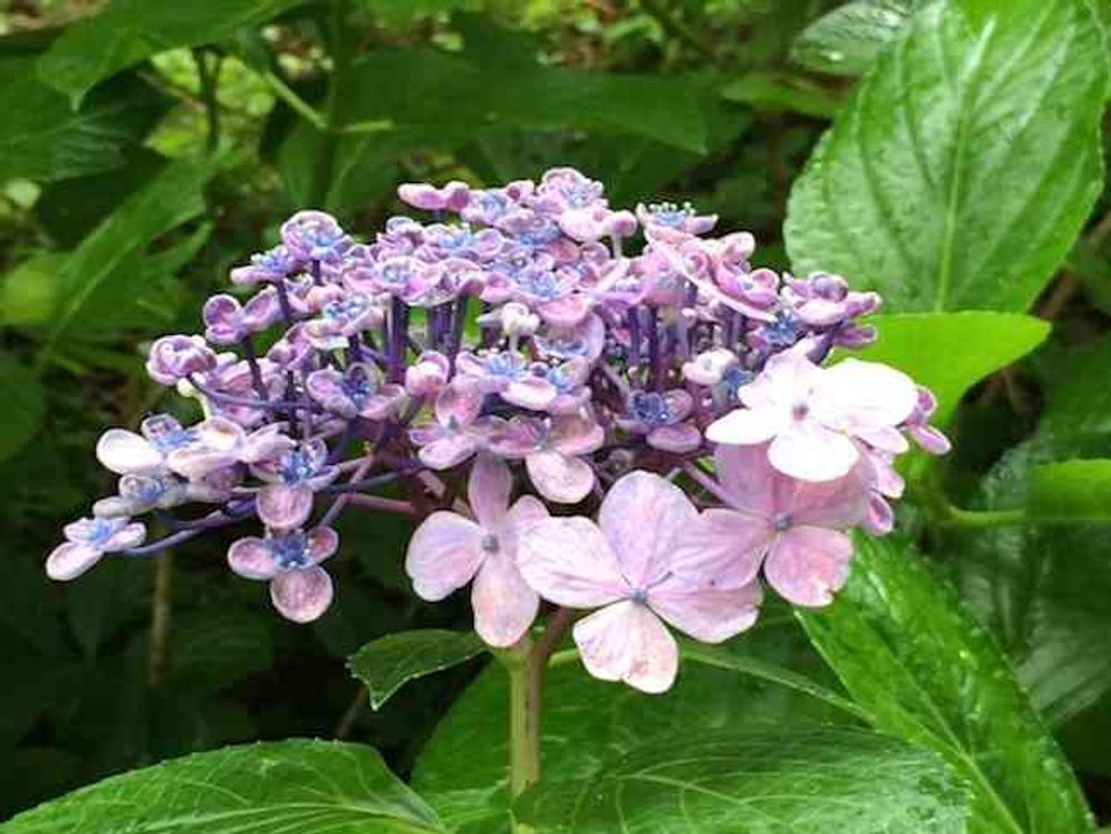 半分オタフクの珍しい紫陽花。近くに別の品種がたくさん植えてある場所なので混ざっちゃったのかな。