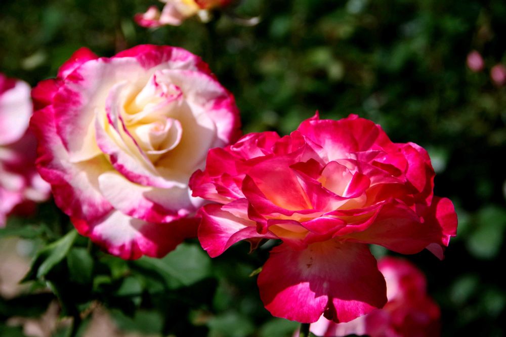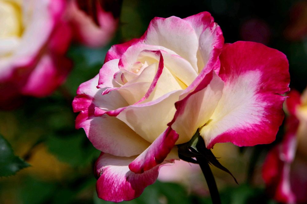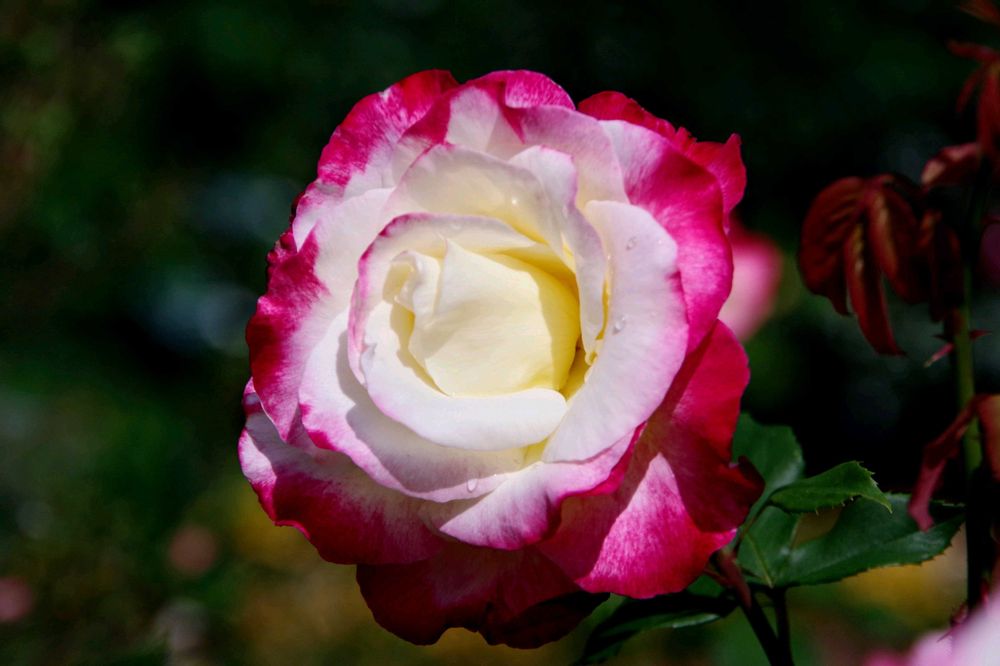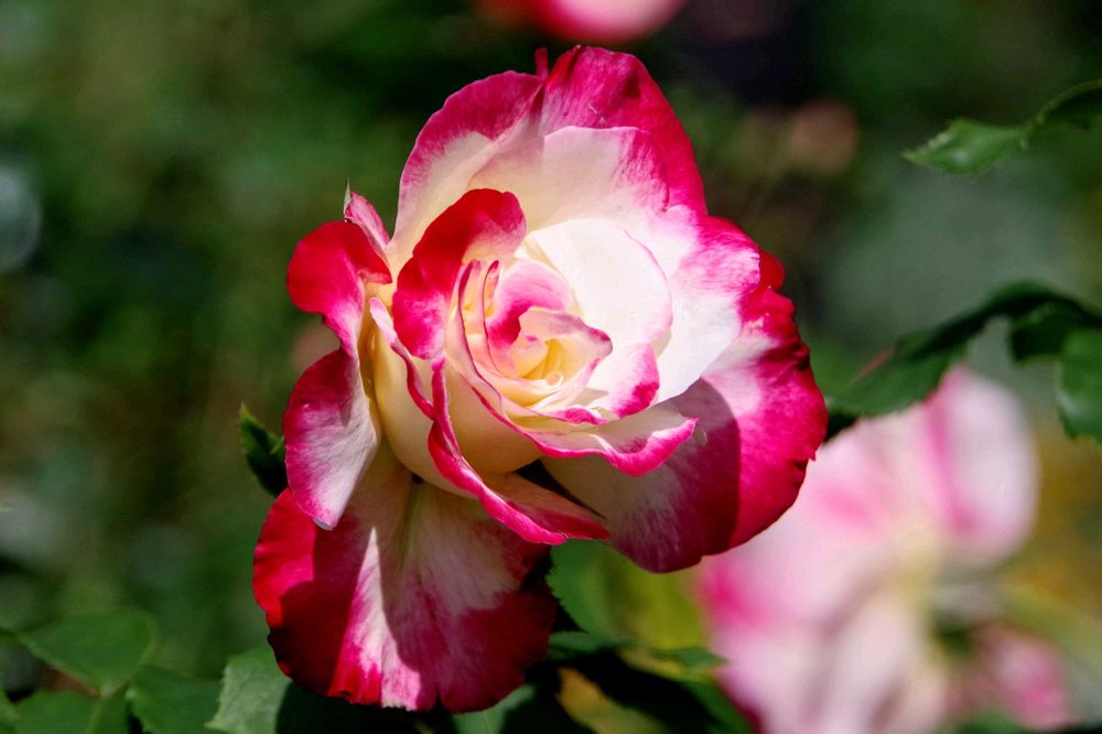 八重咲きの薔薇で、中央の柔らかな白色と外側の花弁の鮮やかな赤い色が、とても見事な調和を保っています