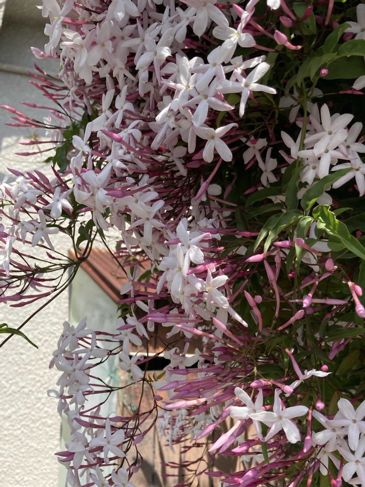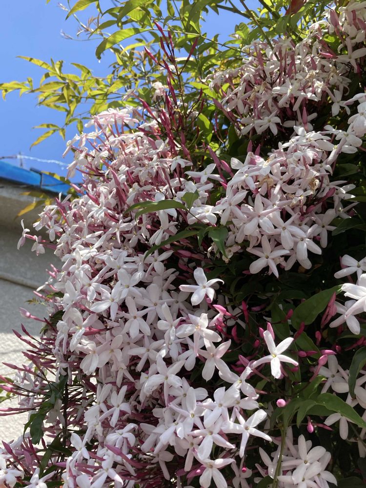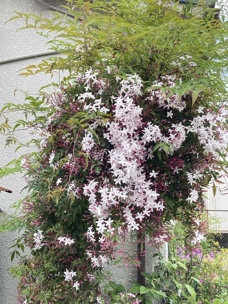 昨日、近所を歩いていたら、すっごい芳香が‼️ 周りを見たら大きな羽衣ジャスミンの株があり、納得しました😉