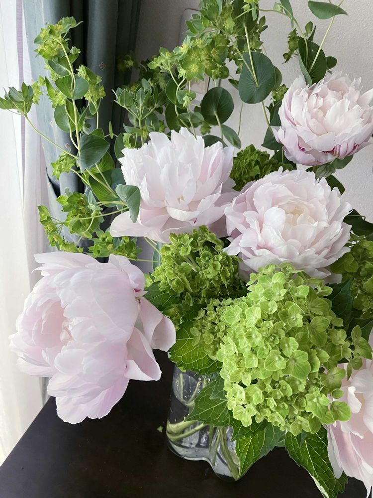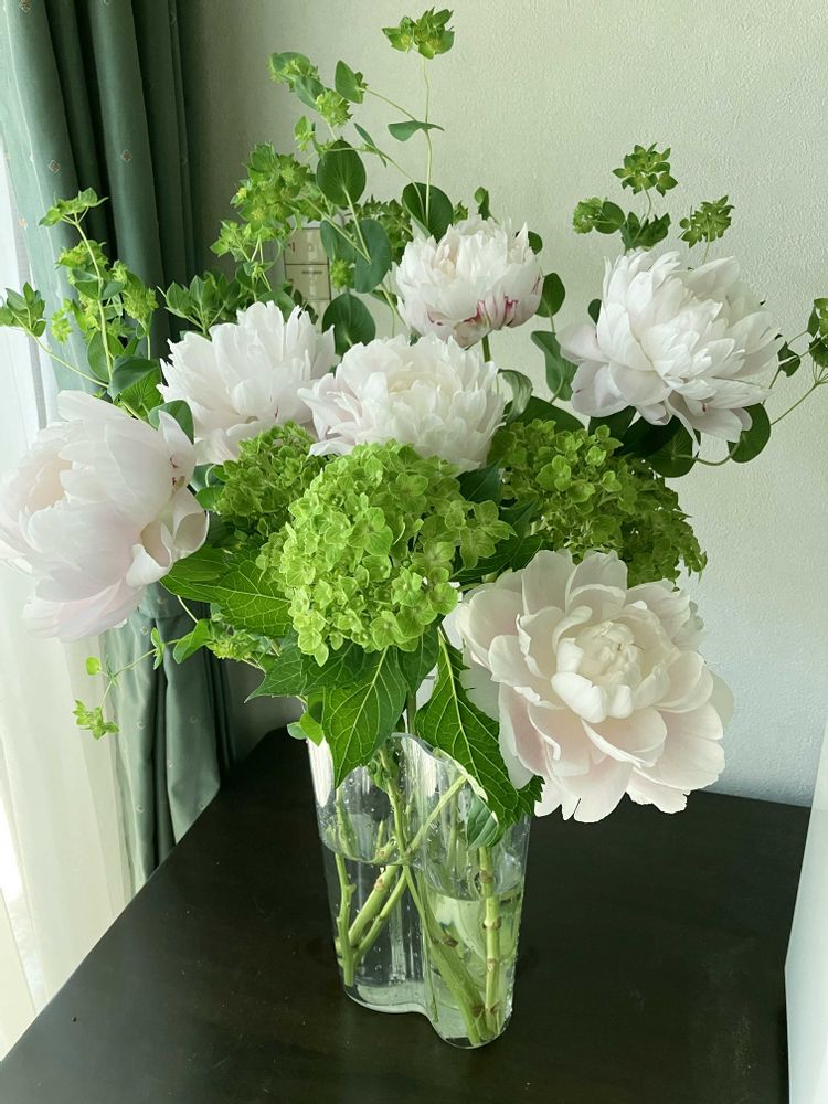 花びらもふもふの芍薬、ほ〜んと素敵。グリーンの紫陽花とのコラボも凄いです。