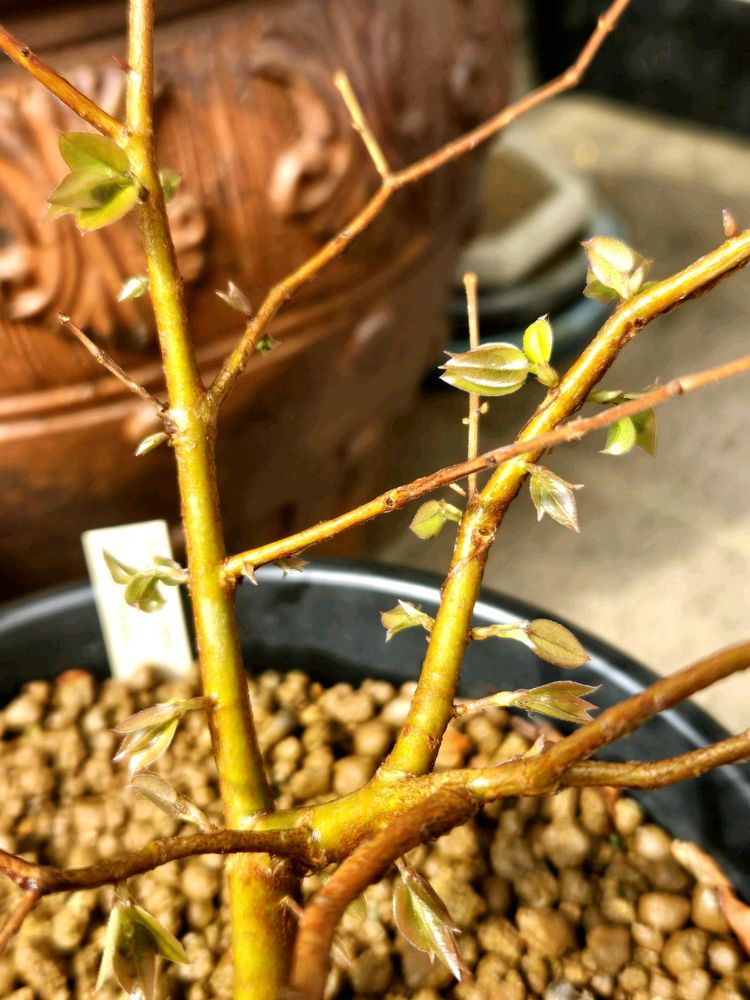 ジャボチカバ、屋内に取り込んで冬越しさせて、3月に軒下に置いたら一気に落葉したので、やっちまったかな~?と、思っていたら、無事に葉が😅