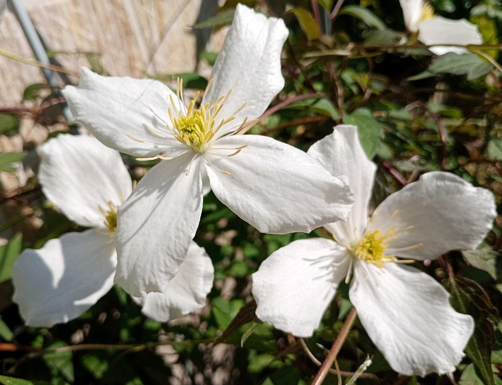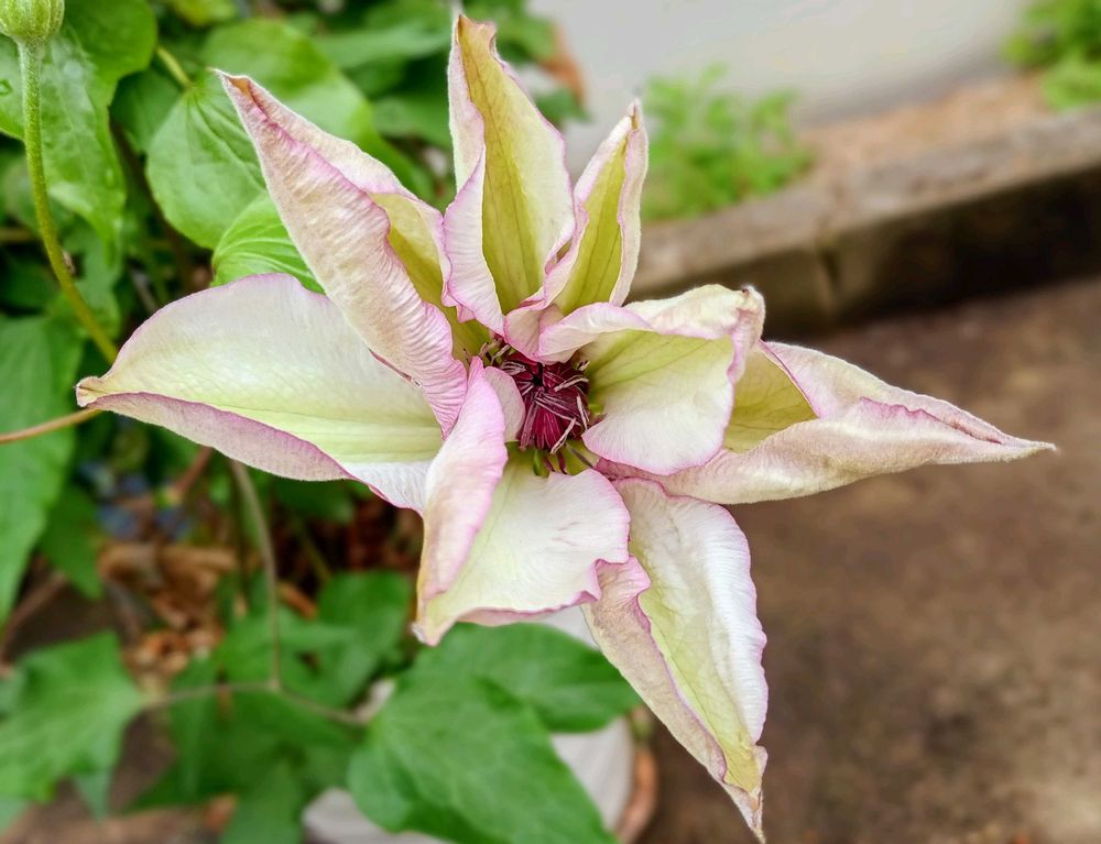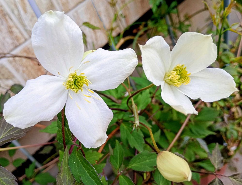 1️⃣2️⃣11月末にレスキュー価格で迎えた クレマチス「ミス・クリスティーン」小さい蕾。咲いてみると 5〜6cm大の花🤍💮🌿