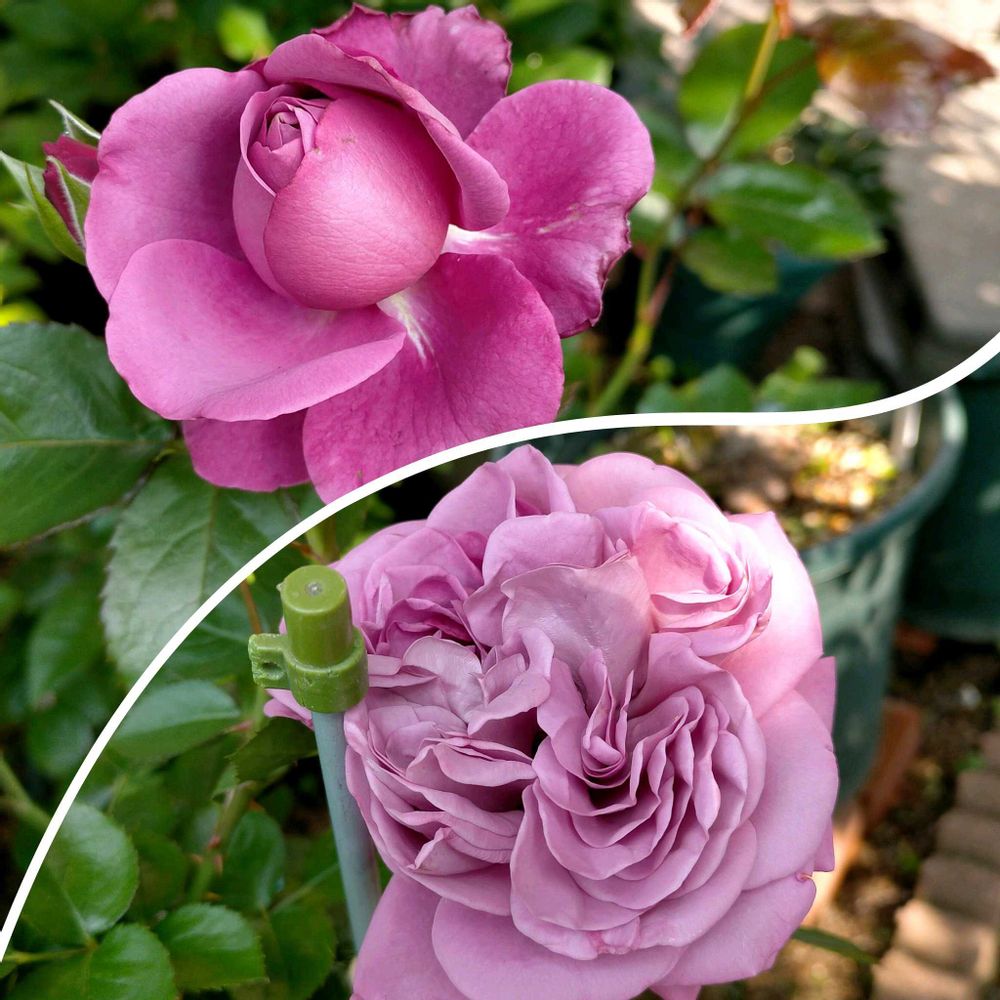 【2枚目】紫のバラ、プラムパーフェクト。咲き始めは色が濃いですが、咲き進むと右下のように退色します。咲き方がゆるいクォーターになってるのかな?
