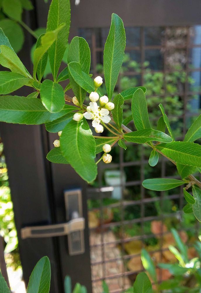 ③うちのピラカンサ、一つ花が咲いていました!😀🎵