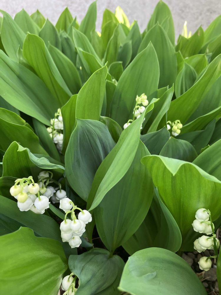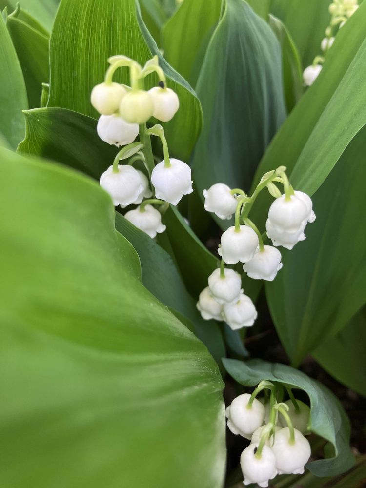キレイな緑色の大きな葉に隠れるように咲いているスズランの花