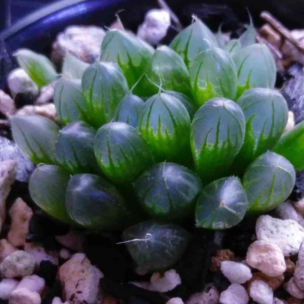 葉先から毛先の様な芒(のぎ)が出ていますね。横っちょにもギザギザと。オブツーサ(truncata)に比べて(徒長の意味?)棒状の葉になりやすく、日の加減で徒長しやすく、またオブツーサよりその形の維持が難しいそうで、品種改良(交配)には向かないそう。オブツーサは芒の有り無しよりプクプクのプリプリの○○が特徴とされています。それらは、生長状態がよいとその特徴差が出やすいそうな?