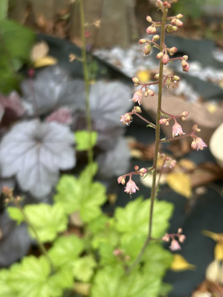 暖かくなってヒューケラが成長してきてます☺️ふと気づいたら小さな花が咲いてました😍茎も細いので遠目だと見落としそうなほど可憐です🥰