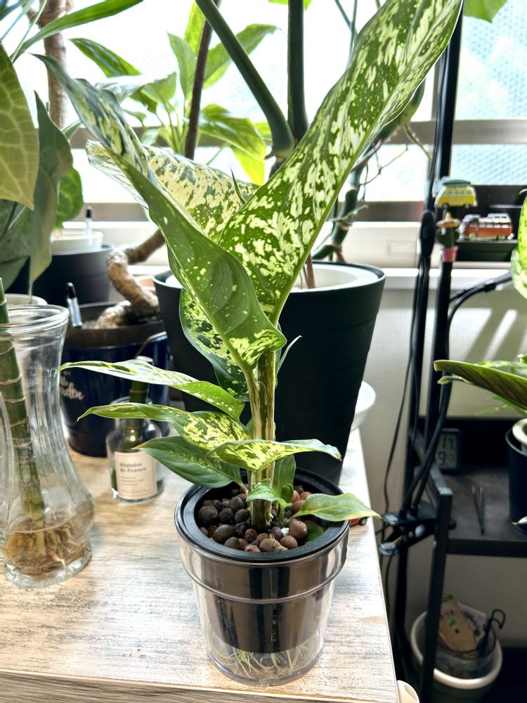 🧪実験中😊セミハイドロポニックス😊半水耕栽培😊ディフェンバキアサブライム😊1ヶ月ほどでたくさん水用の根っこが出てきました😊これで育てると水やりがとっても楽ちんです〜😊土を使用してないので虫も湧かないのもいいです😊