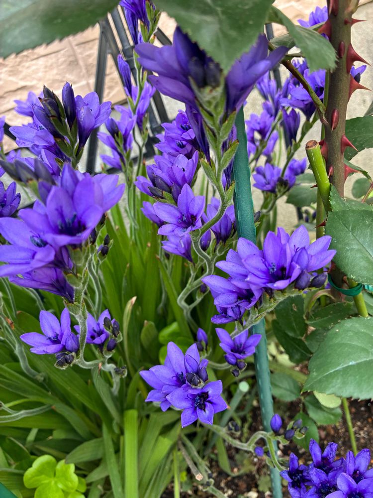 モッコウバラを全部花がらを切りました。少し寂しくなった所へ、オレンジ色のバラと青紫色のバビアナで彩りが出来ました💕🩷❤️