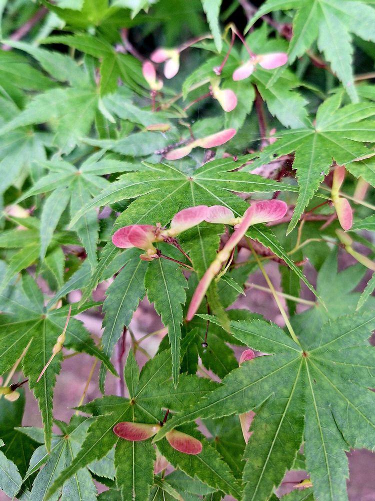 ①②葬儀場の駐車場に咲いていたモミジの花のピンクと葉っぱの新緑のコントラストが美しかったです✨
