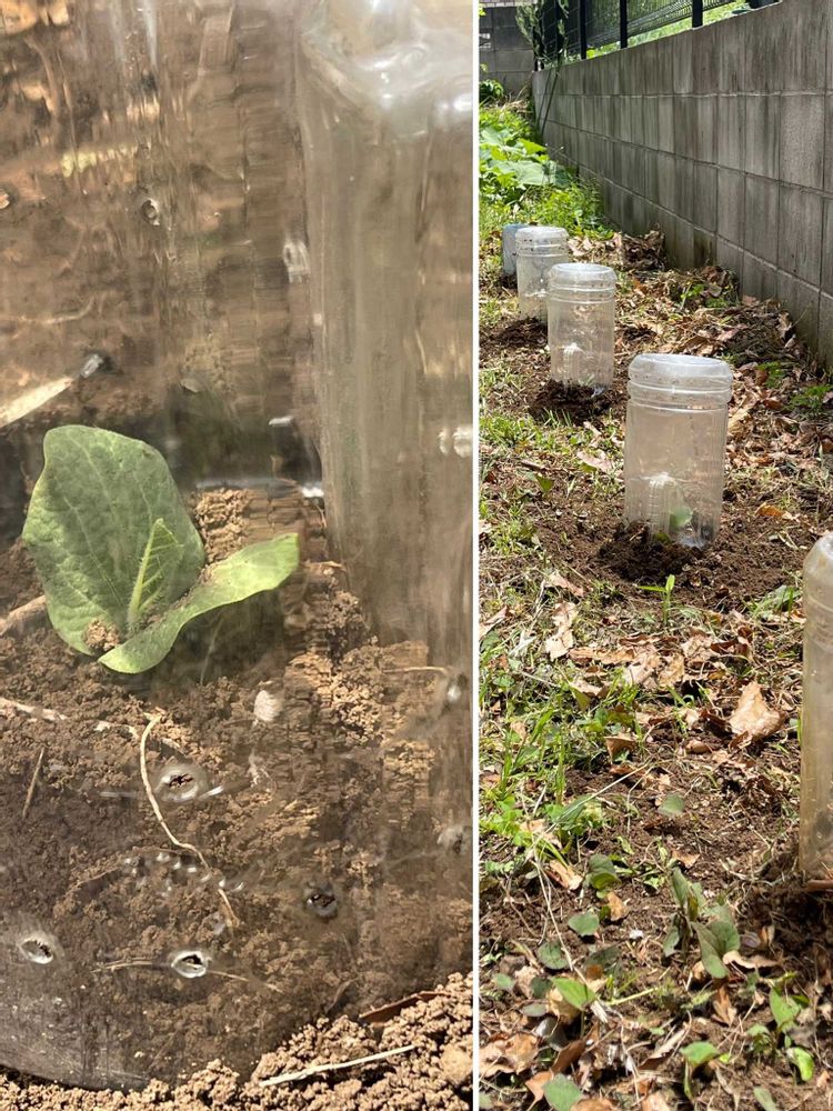 ➍ 土曜日に「明日植えまーす」なんて投稿しました発芽カボチャです❣️ こんな感じに植えてみました🥰 去年までと違う場所にしてみましたが、さてさて今年はどのくらいワクワクさせてくれる事でしょうか😲