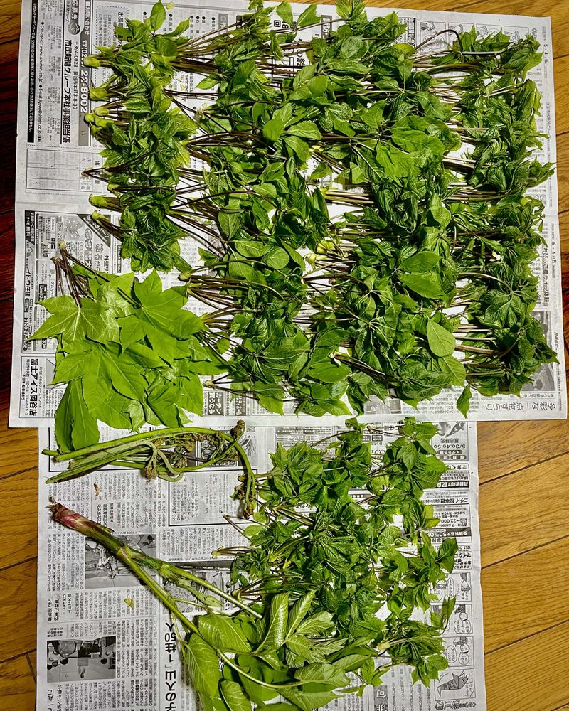4枚目:うちに帰って仕分けしたところ。左側真ん中の違う種類の葉っぱはハリギリ(栓の木)。下はウド