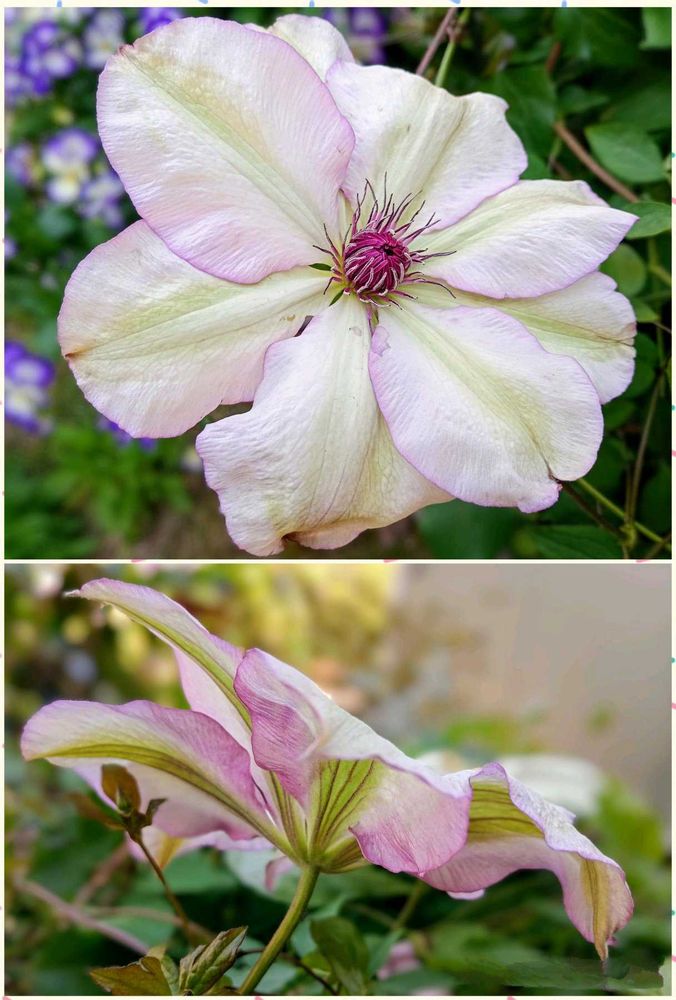 1️⃣クレマチス、6株、月宮殿に続き「フォンドメモリーズ)も前Picより伸び伸びと開花💮🤍💜