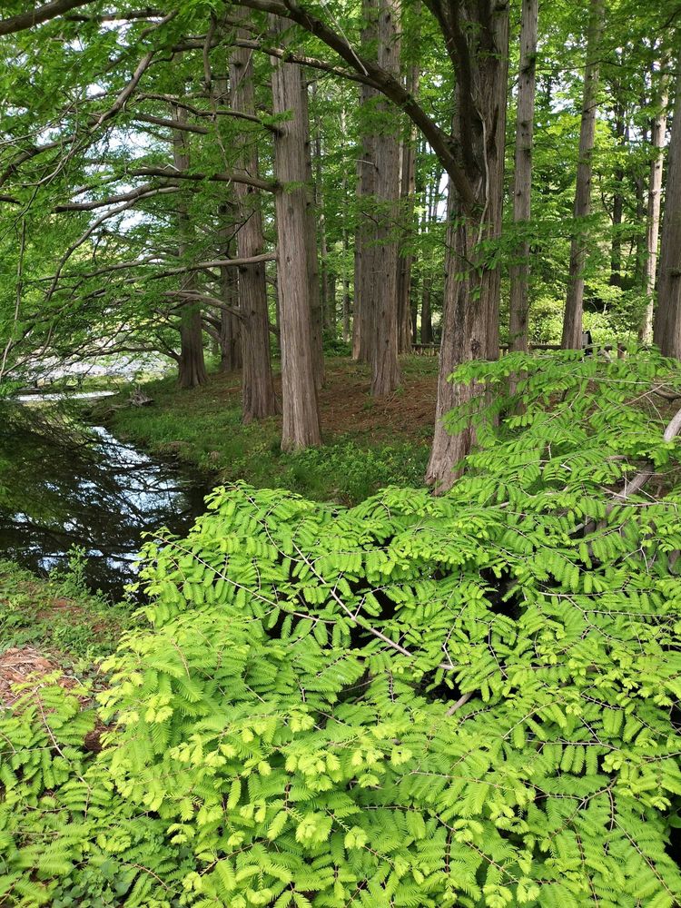 メタセコイアの深緑、綺麗ですね~。小川?の水とマッチして更に趣きが❢