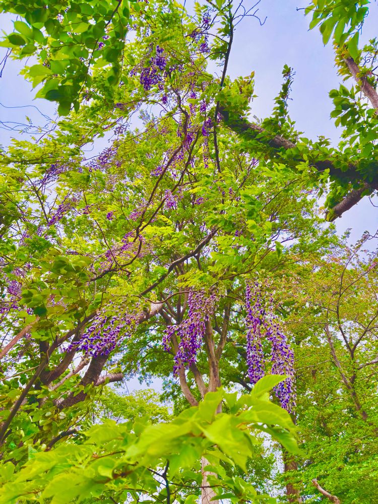 木の枝に絡みついて、高い所からぶら下がって紫色の花💜風にそよそよ