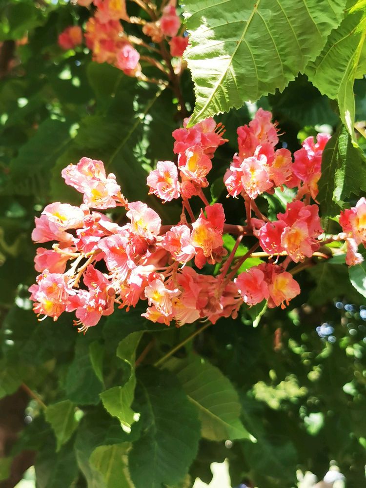 銀座には、この花(ベニバナトチノキ)のマロニエ通りがあります。通りの両側にベニバナトチノキの花が咲いています。🩷🎀🎶